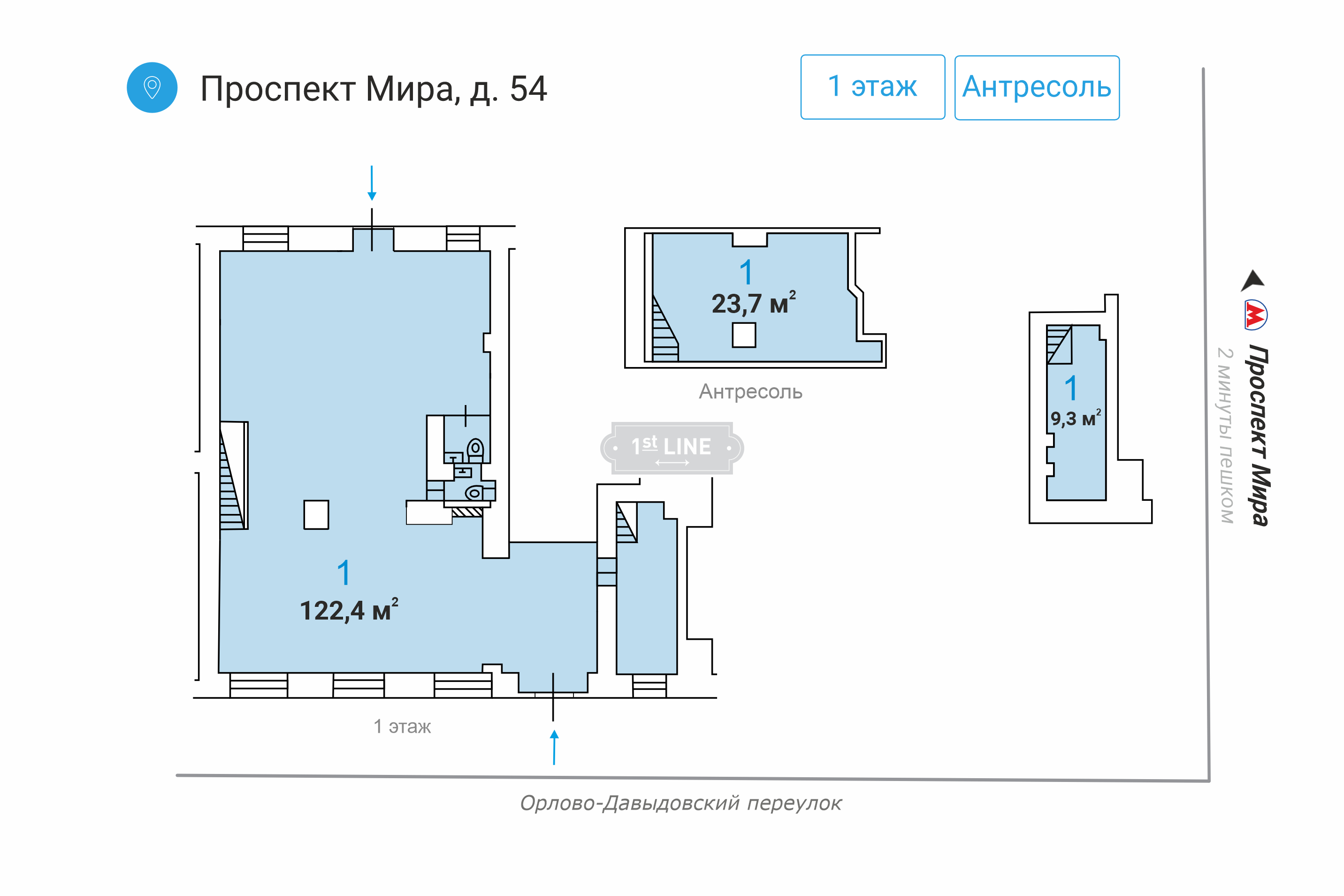 Помещение находится на первом этаже и антресоли дома, в шаговой доступности от метро "Проспект Мира" (3 минуты пешком).